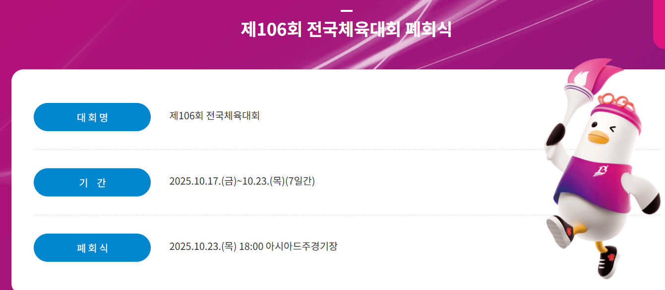 제106회 전국체육대회는 2025년 10월 17일(금)부터 10월 23일(목)까지 7일간 부산 전역에서 개최됩니다. 전국 17개 시·도 선수단이 참가해 육상, 수영, 축구, 야구 등 49개 종목에서 열띤 경쟁을 펼칠 예정이에요.