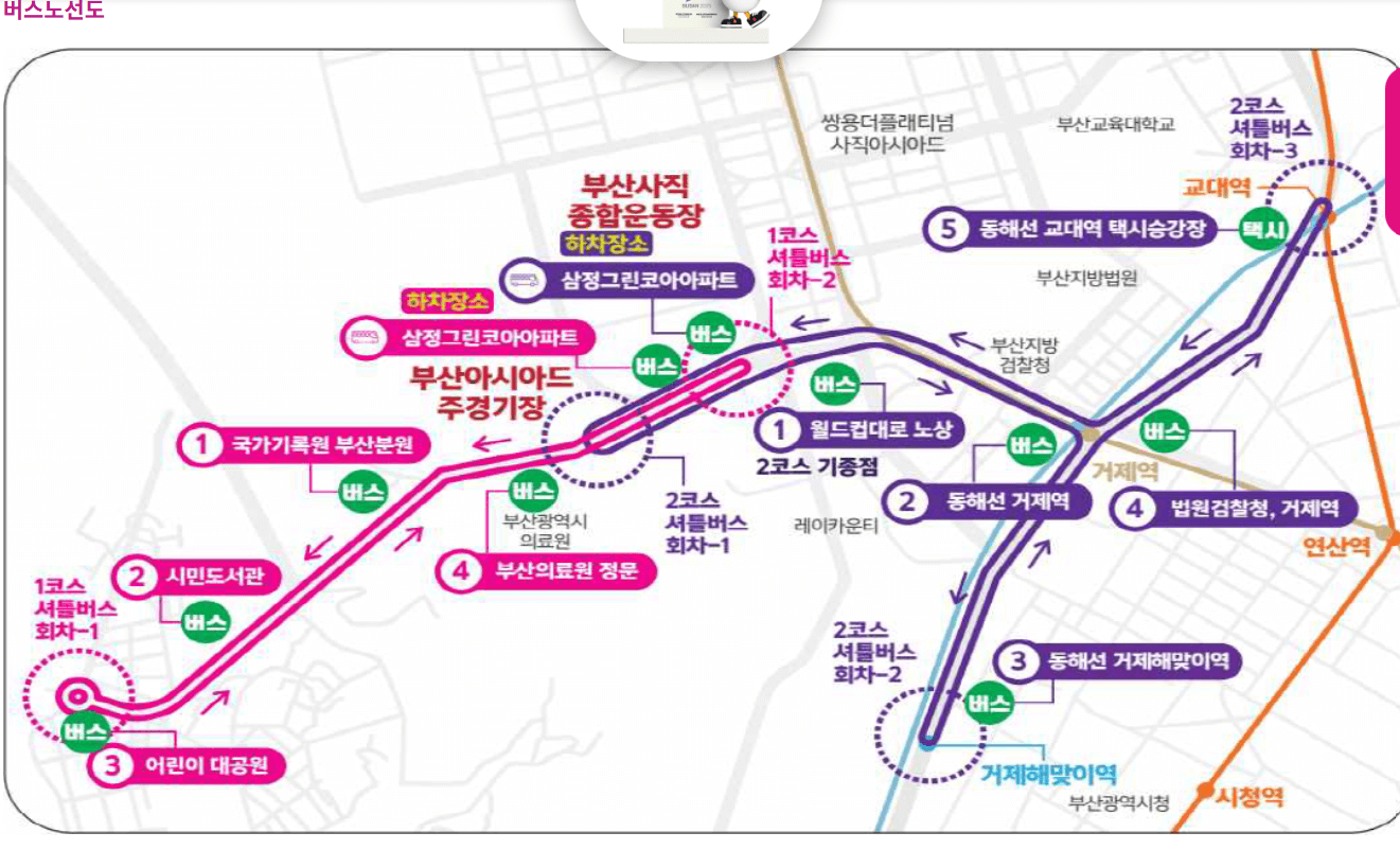 모든 경기장은 부산도시철도와 버스 노선이 잘 연결되어 있어 대중교통 이동이 편리합니다.