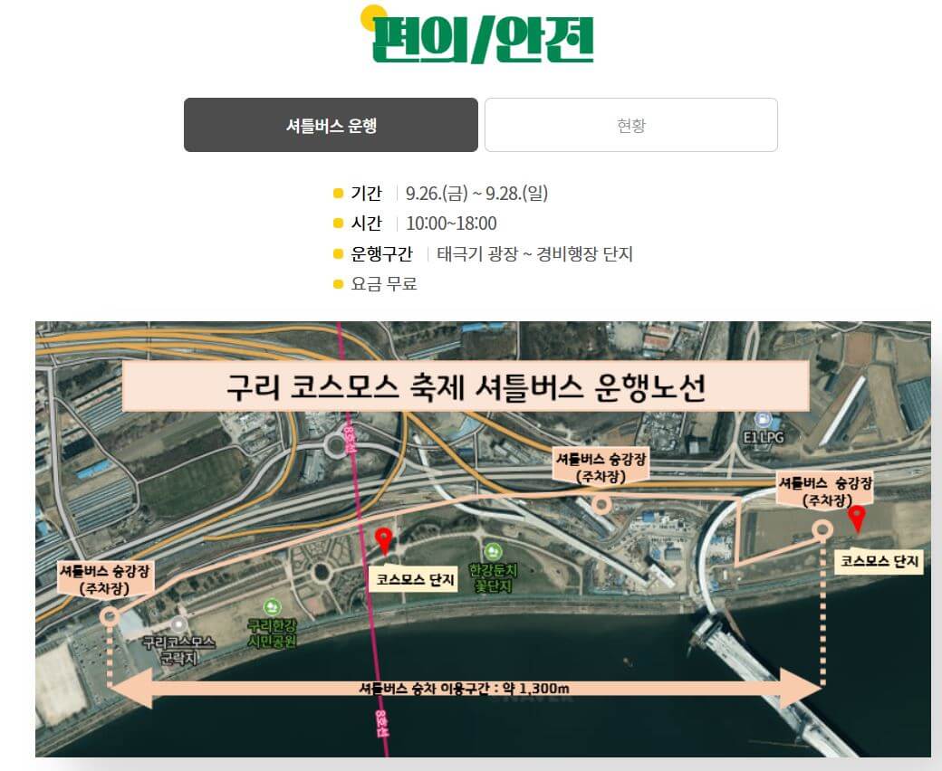 - 주요 행사: 코스모스 꽃밭 관람, 불꽃놀이, 문화 공연, 체험 부스, 먹거리 장터 등