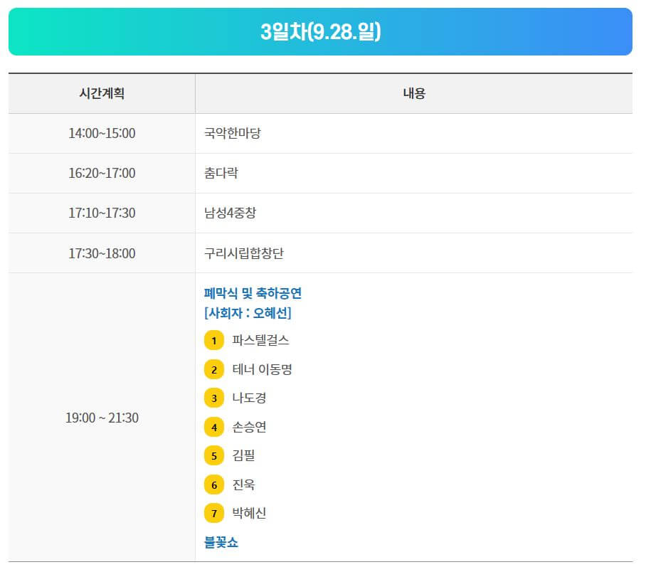 올해 축제의 또 다른 즐거움은 풍성한 공연 라인업입니다. 구리시가 공개한 주요 라인업은 다음과 같습니다.
